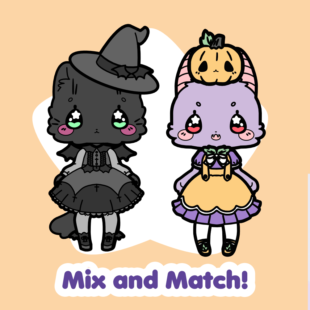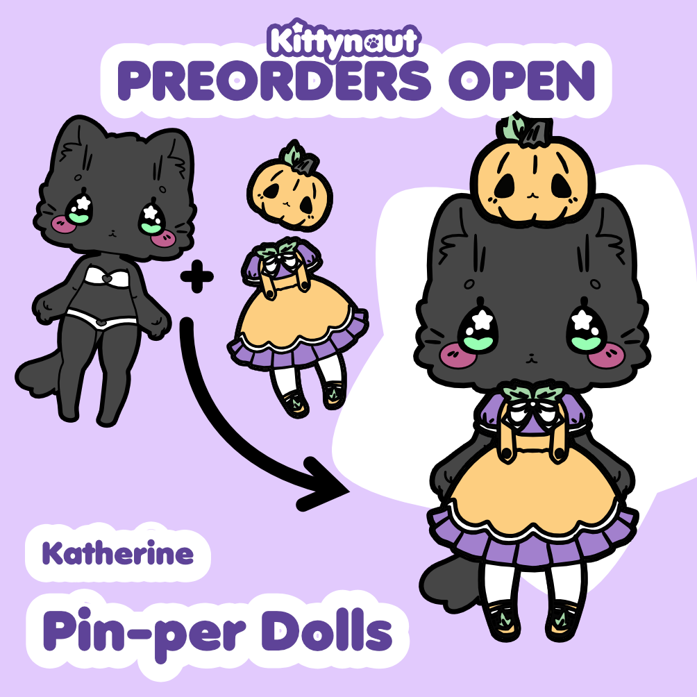 Katherine is 2.1" tall and has 2 posts. Includes her signature dress up set: Halloween lolita dress (with Pumpkin vibes. approx 1.25" tall with 2 extended posts) and a pumpkin hat that can be worn multiple ways (approx .6" tall with 1 extended post).