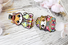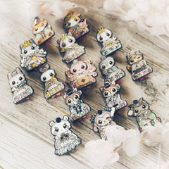 | Examples showing some defects - poor plating, dripped/overrun enamel | Examples of potential coloration issues -- these tend to be present only in certain specific batches. if you're unsure, send us a message. | Examples of common defects - scratches, pores, specks, and punctures. |