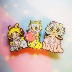 | Examples showing some defects - poor plating, dripped/overrun enamel | Examples of potential coloration issues -- these tend to be present only in certain specific batches. if you're unsure, send us a message. | Examples of common defects - scratches, pores, specks, and punctures. |